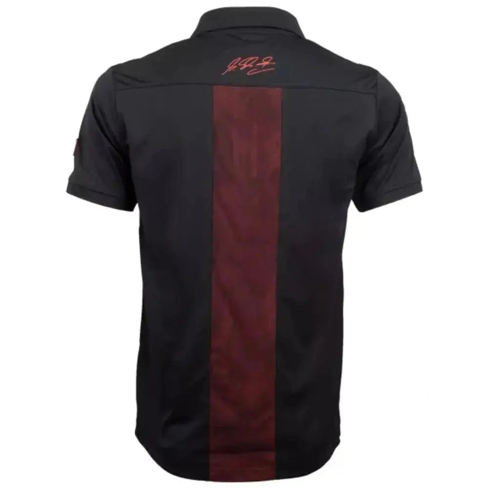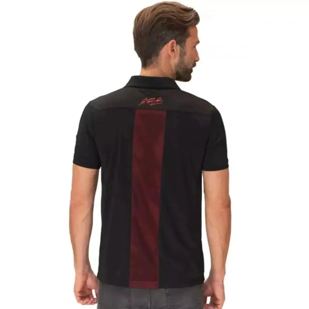Michael Schumacher polo shirt from the Speedline collection in black color. The polo shirt with black-grey Speedline design bears the Michael Schumacher logo on the chest and the signature on the back in the neck area. On the sleeve there is a patch with the MS logo.