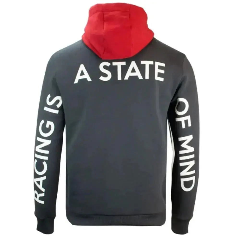 The Series 2 hoodie in anthracite has the Driver logo, which is a combination of Mick's profile and his Formula 1 starting number, printed in white on the front. In addition, there is the quote "Racing is a state of mind" on the back of the sleeves and shoulder. The ribbed cuffs at the hem and the contrasting red hood complete the design. The hoodie is made of high-quality cotton with added polyester and is comfortable to wear.